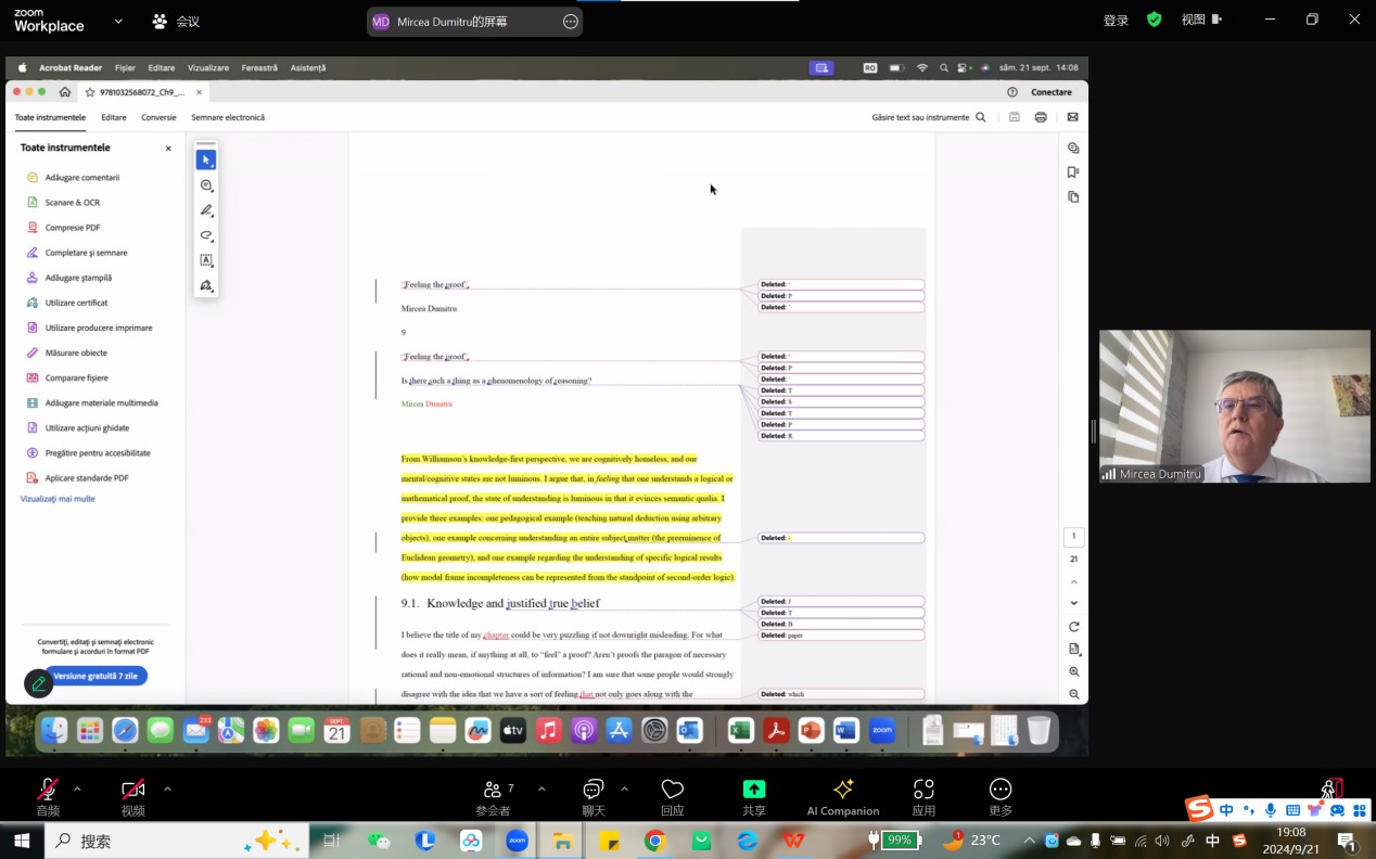 本网讯(通讯员 鲁彦君) 9月21日晚,应探花系列 陈波教授邀请,哲学教授、罗马尼亚科学院副院长、欧洲科学院院士,国际哲学院(IIP)院士及前主席,米尔恰·杜米特鲁(Mircea Dumitru)做题为“‘感受到一个证明’:存在像推理现象学这样的东西吗?”的讲座。讲座由探花系列 程勇教授主持,四川大学哲学系徐召清副教授评议。来自国内外的110余名听众参与本次线上讲座。