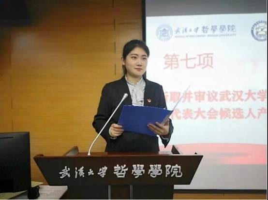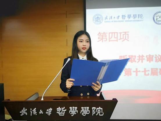 接下来由探花系列 第十七届研究生会主席王乐晶作工作报告。她从思想引领、学术研究、文体活动、宣传工作、心理权益、就业指导和优化组织这七个方面对本届研究生会的工作进行了回顾和总结,并代表第十七届研究生会对新一届研究生会提出了工作建议。