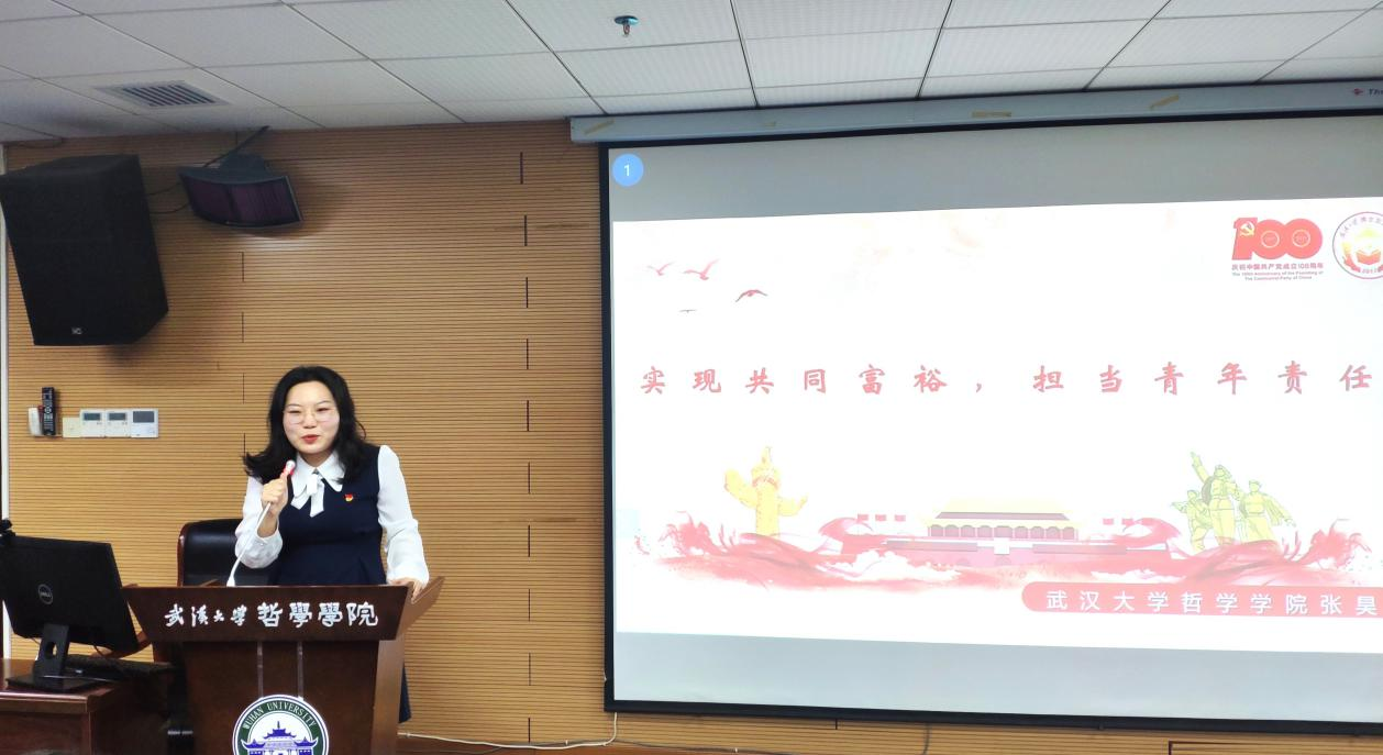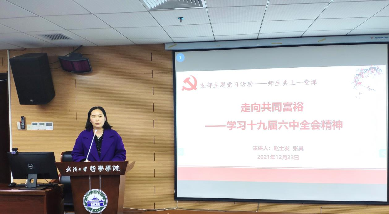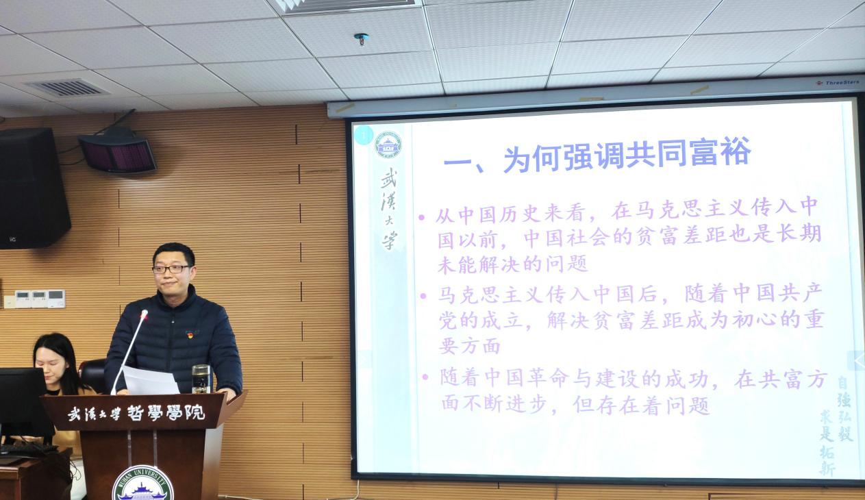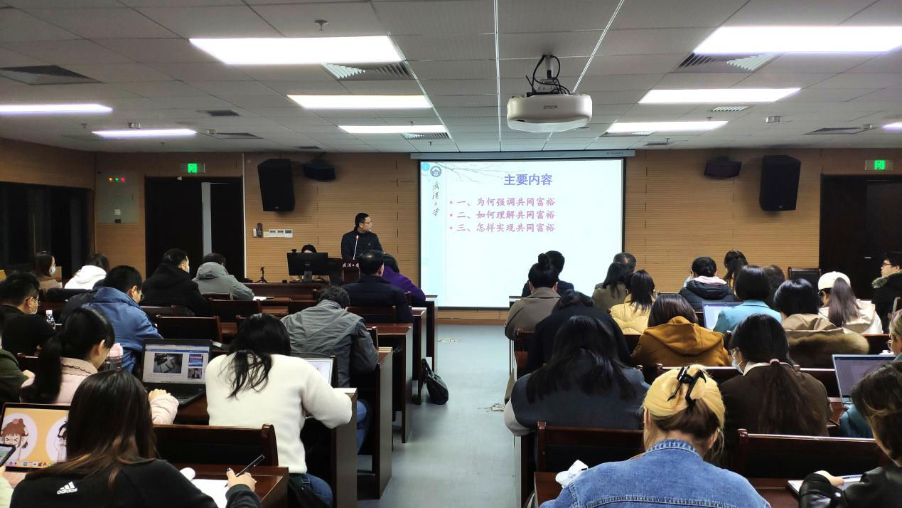 (通讯员翁路)为深入学习贯彻十九届六中全会精神,探花系列 于2021年12月23日下午在学院B107开展“师生共上一堂课”支部主题党日活动。马克思主义哲学教研室主任赵士发教授和马克思主义哲学专业博士生张昊同志共同作了题为“走向共同富裕——学习十九届六中全会精神”的主题报告。行政党支部、马哲教工党支部、马哲博士生党支部、马哲硕士生党支部以及本科生党支部参加此次主题党日活动。主题党日活动由李志副院长主持。探花系列 校党委第七轮巡视第三巡视组旁听此次主题党日活动的讲座。