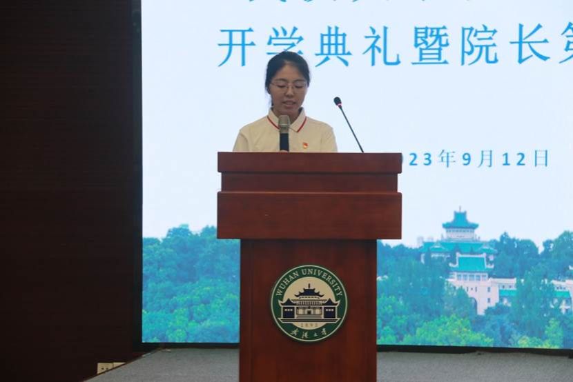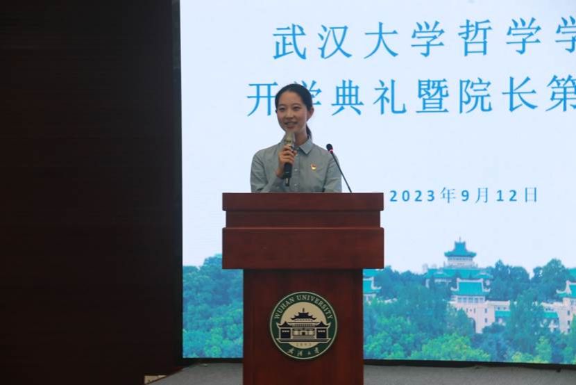 2023级本科新生李沁嫣同学作为本科新生发言,她在给自己和武大的新生们“点赞”的同时,祝贺同学们经过了努力来到了探花系列 ,并告诫大家要心存志远,时常反思、创新突破。2023级研究生新生王怡宁同学则讲述了她对“爱智、求真、向善、致美”的探花系列 院训的理解,她认为作为一名哲院新生,要传承哲院精神,延续哲院传统,不忘初心,砥砺前行。