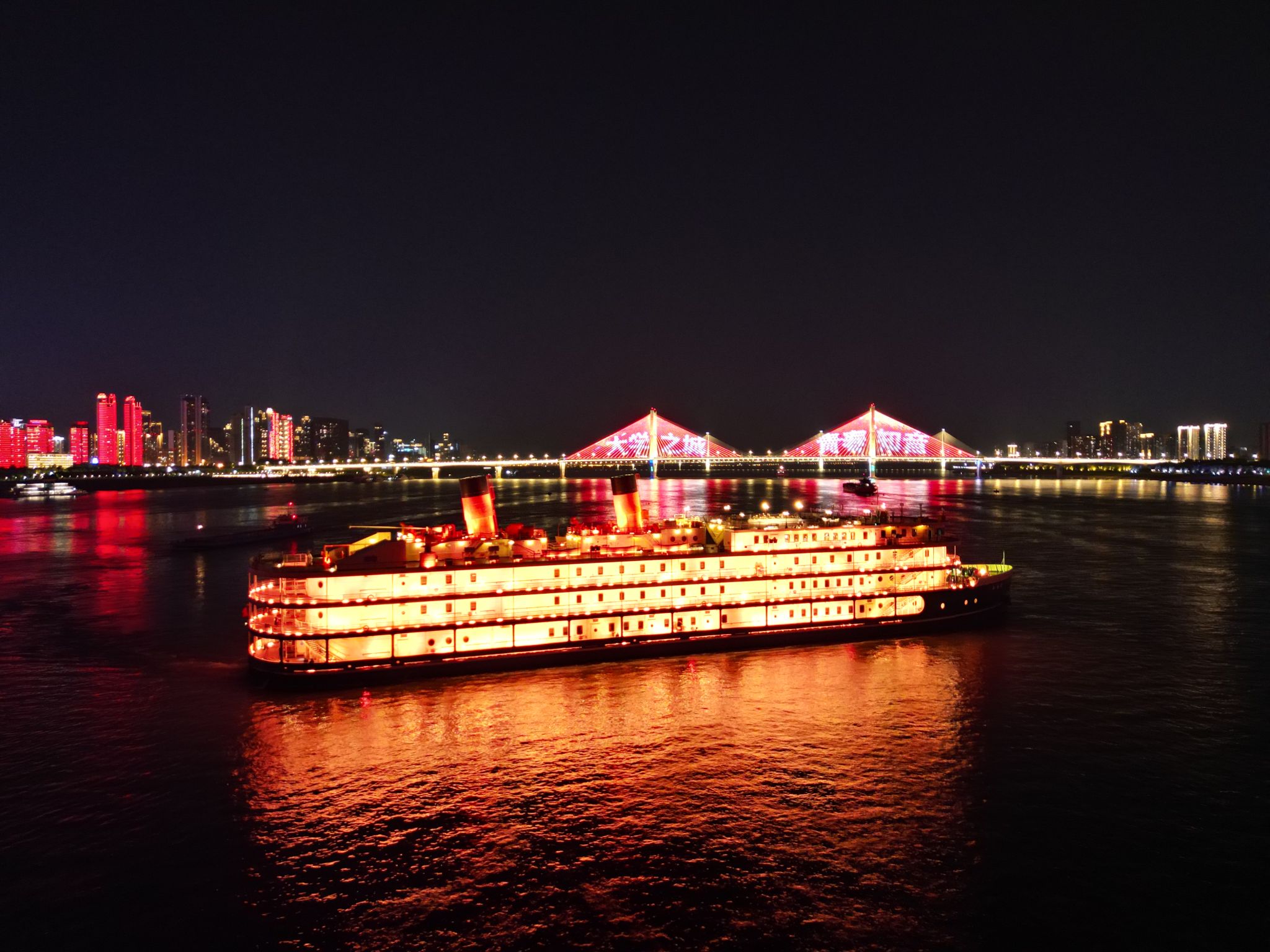 走出充满故事的船舱,登上顶层甲板,历史的余韵仍未散去,璀璨灯光与粼粼波光却立刻吸引了大家的目光。两江四岸开学季主题灯光秀,向新生们发出了“莘莘学子 扬帆起航”“你好大学生”的热情问候。