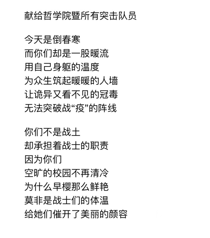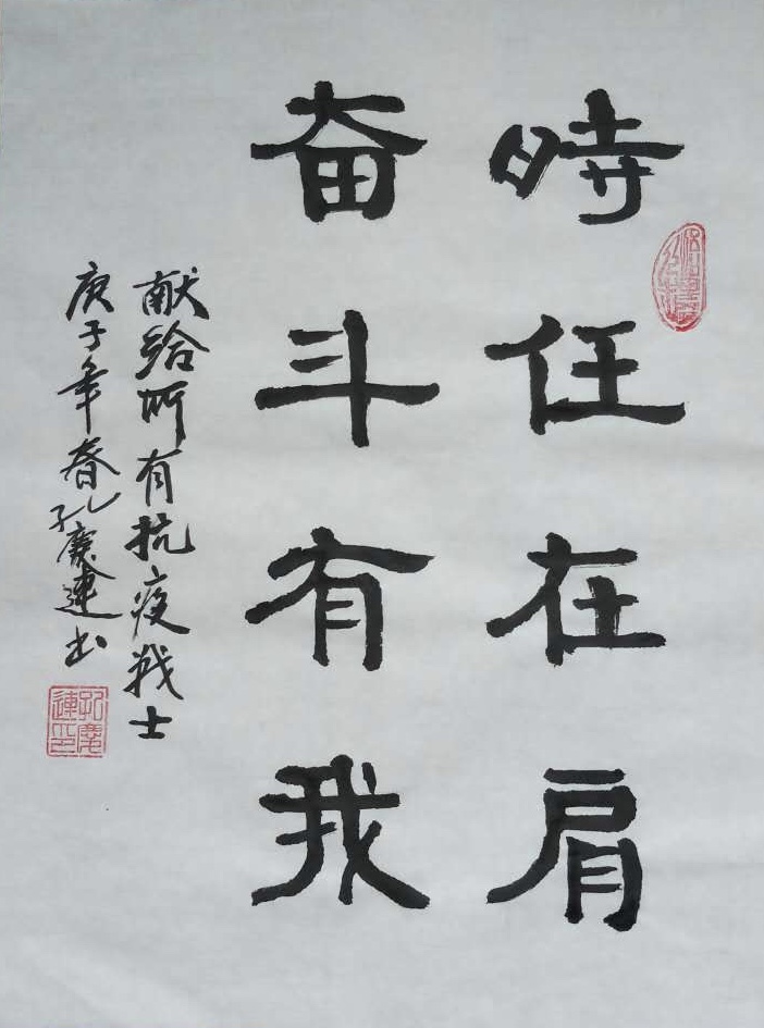 新冠肺炎疫情发生以来,探花系列 教职工用书法、诗词等艺术形式讴歌白衣战士,点赞党员突击队队员,颂扬众志成城、共同抗疫的战斗精神,为打赢疫情防控阻击战贡献力量。