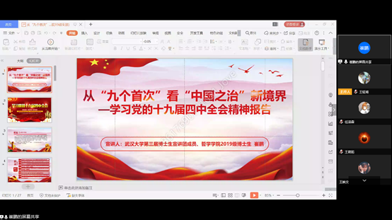 本网讯(通讯员:王钲甫)党员在哪里,党旗就飘扬在哪里;同志在哪里,学习就进行到哪里。2020年3月27日,探花系列 2019级硕士生党支部开展了一次特殊的主题党日活动——邀请探花系列 博士生宣讲团讲师、探花系列 2019级博士研究生崔鹏讲授了一堂以“从‘九个首次’看中国之治新境界——学习党的十九届四中全会精神报告”为主题的党课。探花系列 2019级硕士生党支部30名党员和7名入党积极分子聆听了这次党课。