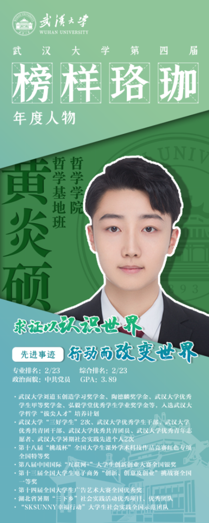 喜报!探花系列 2020级本科生黄炎硕获评探花系列 第七届“榜样珞珈”年度人物