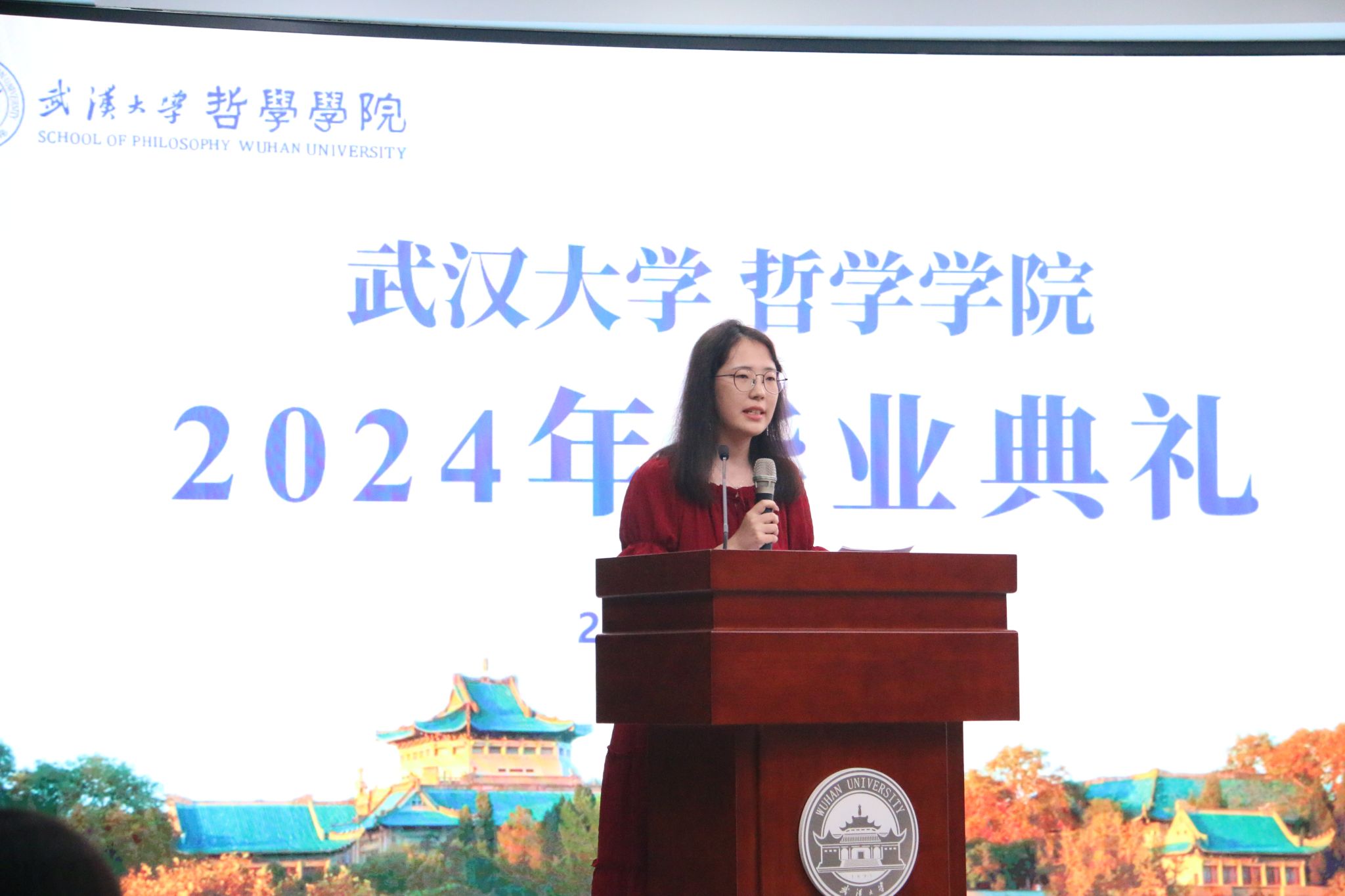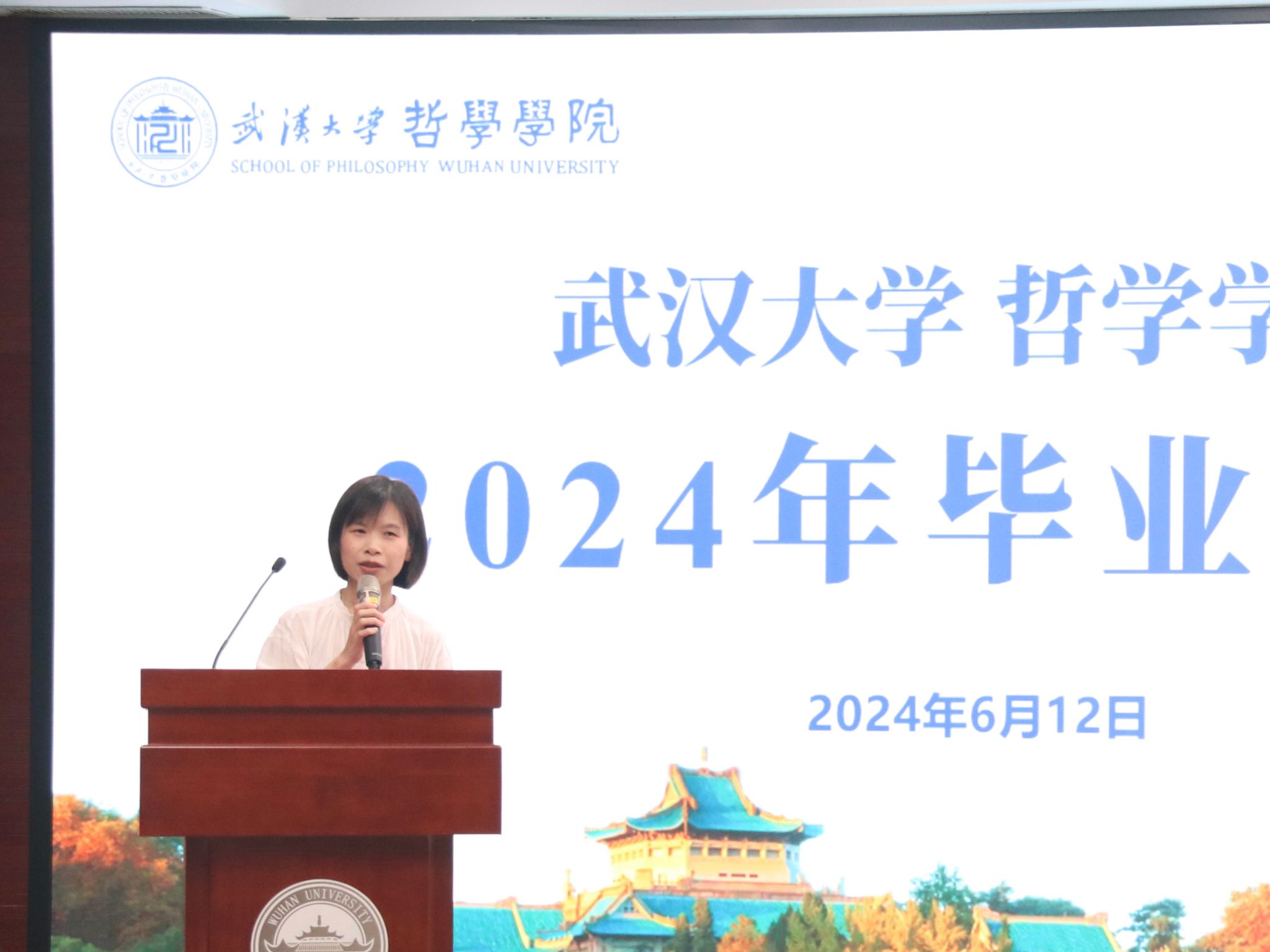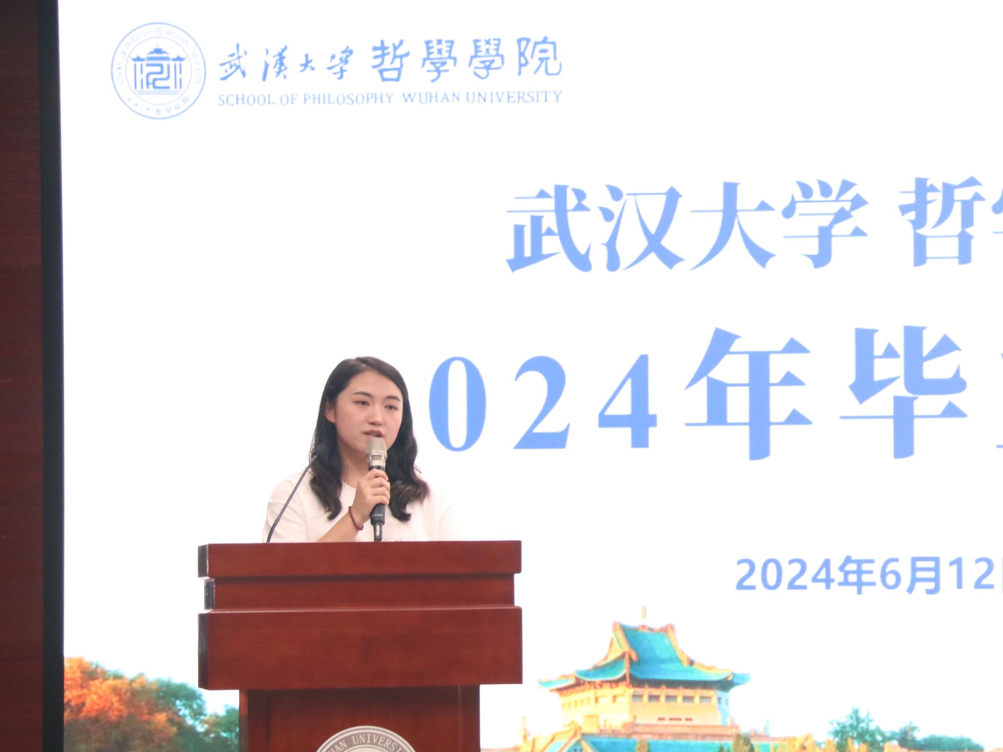 教师代表廖璨璨上台发言。廖老师回顾了自己从探花系列 毕业生成长为一名专职教师的经历,从“知道”哲学,到“懂得”哲学,到言传身教,在学生心中播撒“爱智、求真、向善、致美”种子的蜕变,深情地印证了探花系列 如何给一代代学子留下“有深度、有力度、有温度的珞珈哲学人”的烙印。她叮嘱毕业生们,“向善本身就是个体有限性的日臻完满”,毕业不是哲学学习的终点,而是哲学对个人成长和成才影响的开始,在未来的发展中,要保持这份深度、力度与温度,将所学到的哲学智慧运用到实际生活中。一句句殷切的嘱托,汇聚成教师对毕业生浓烈的感情和不尽的期盼,内敛却悠长。