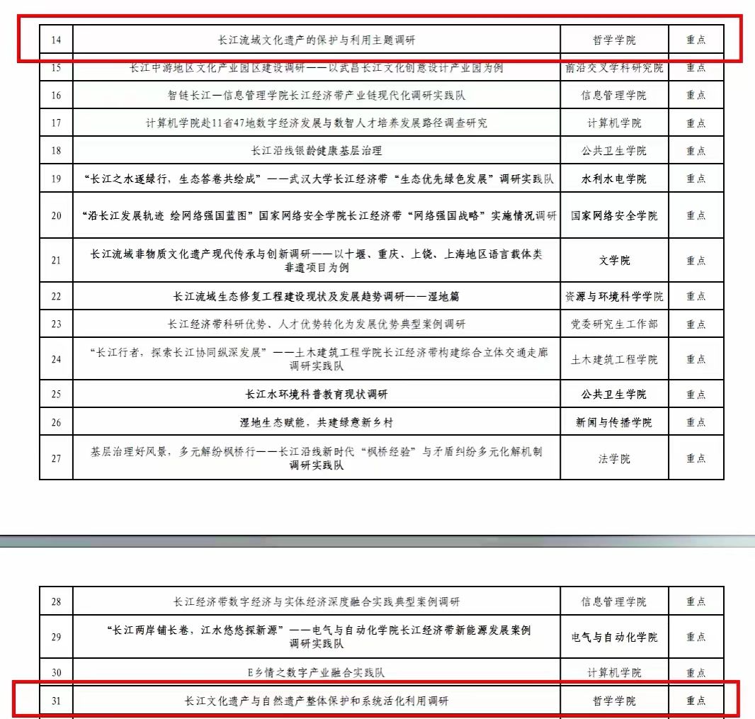 2024年暑假,学院接续推进实践育人工作稳步前进,积极组织学生参与暑期社会实践活动,2个项目获评探花系列 “青春共建美丽长江经济带”揭榜挂帅专项实践重点项目。哲院学子将在学院的有序推进和老师的倾情指导下,前往湖北省武汉市、荆州市、四川省宜宾市等12地展开实践调研,将理论知识融入社会实践中,用脚步丈量中国大地。