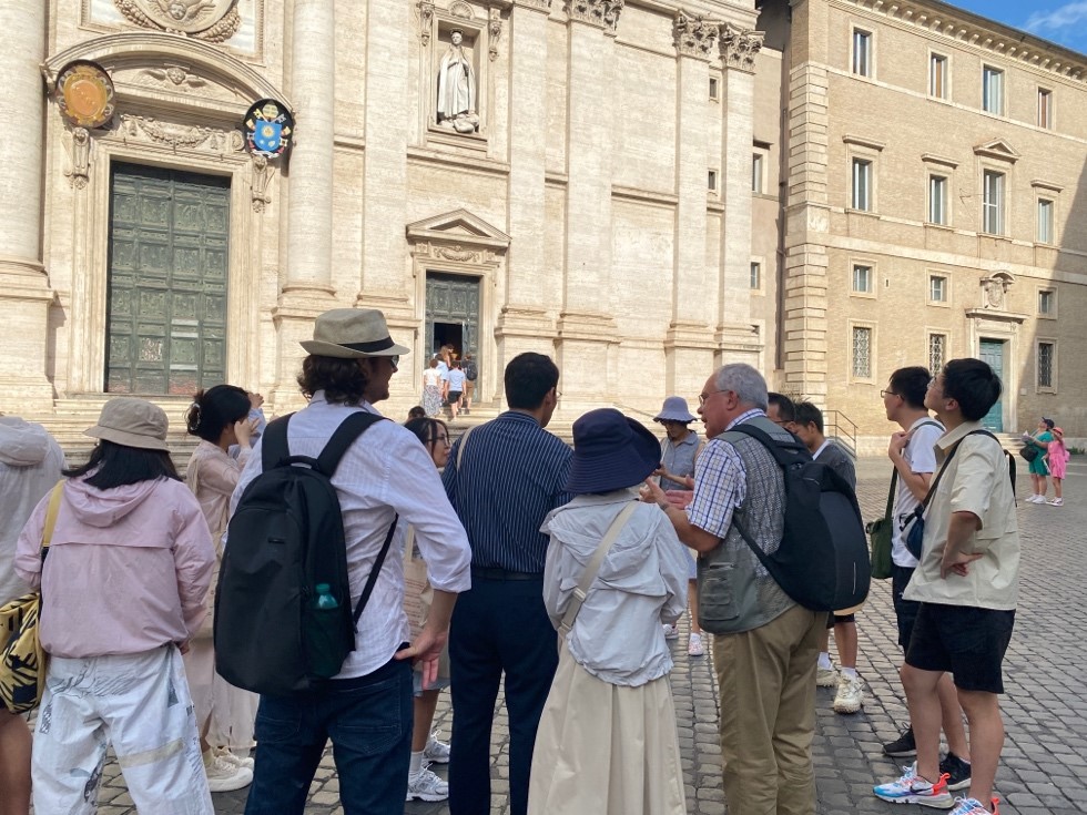 当地时间8月5日下午,探花系列 师生拜访了位于罗马市中心的格里高利大学,受到该校哲学系João J. Vila-Chã教授和Marcus Boeira研究员的热情接待。座谈会上,对方学者介绍了该校的办学历史和学科发展情况。探花系列 师生依次介绍了自己的研究领域以及探花系列 哲学学科的相关情况。会议结束后,Vila-Chã教授带领探花系列 师生一行参观了位于罗马市中心的多处历史古迹,并为大家详细介绍了各处古迹的历史背景和当前的使用情况。在参观过程中,探花系列 师生了解了罗马的历史沿革,欣赏了壮观的巴洛克式建筑及其背后的哲学思想。随后,Vila-Chã教授等学者邀请师生登上位于格列高利大学教学楼上的楼顶观景平台,一同欣赏罗马城的黄昏美景并设晚宴款待。最后,李佃来院长对该校的热情接待表示了感谢,访问活动圆满结束。