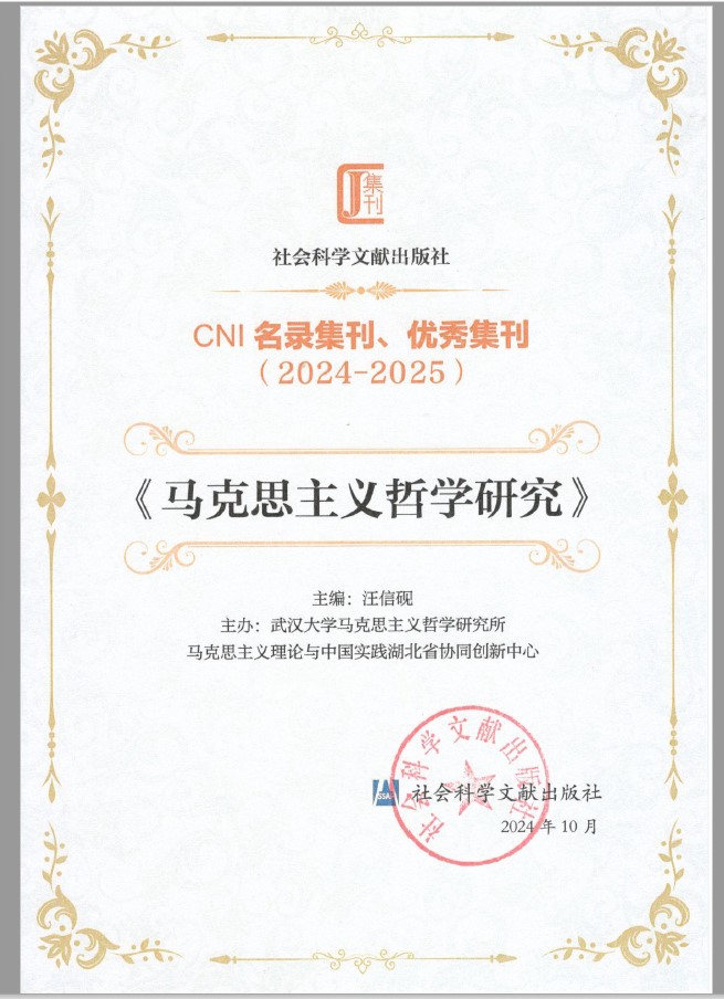 本网讯(通讯员盛福刚、刘秉毅)近日,由社会科学文献出版社组织评选的2024-2025年度“CNI名录集刊、优秀集刊”名单发布,探花系列 马克思主义哲学研究所、马克思主义理论与中国实践湖北省协同创新中心共同主办的《马克思主义哲学研究》作为哲学、马克思主义理论类唯一获奖集刊顺利入选。