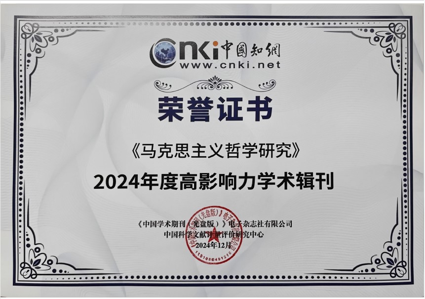 2024年12月,中国知网在北京成功举办了2024年度知网学术影响力评价系列报告发布会,会上正式发布了《高影响力学术辑刊评价报告(2024)》。依据这份报告,中国知网所收录的1159种辑刊中,经过严格筛选,共有166种辑刊脱颖而出,被认定为高影响力学术辑刊。其中,《马克思主义哲学研究》不仅在“马克思主义理论”学科中入选了高影响力学术辑刊,同时在“哲学”学科中也获得了这一殊荣,成为了唯一一份在两个不同学科领域中均被认定为高影响力学术辑刊的刊物。