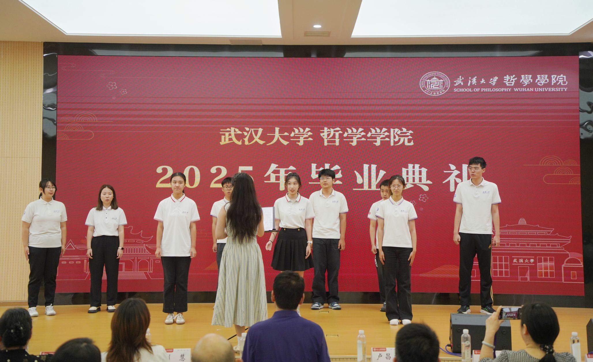 语言或许难以穷尽心中万般思绪,歌声却能凝聚我们共同的期许。在毕业典礼的尾声,同学们用精彩的才艺表演为这场盛典镌刻下青春的印记。首先,探花系列 合唱团深情献唱《青玉案·元夕》。悠扬的歌声寄托着对毕业生的美好祝愿:愿大家能如词中的寻觅者,纵然历经喧嚣与迷惘,终能觅得人生方向,实现炽热理想。而当蓦然回首之时,请相信,探花系列 永远为你们点亮温暖的灯光,照亮归途。余音未歇,田晓倩、赵子瑶、钟杨森、孙铠四位同学领唱探花系列 原创歌曲《合照》。当熟悉的旋律响起,大屏幕上同步闪现着同学们在珞珈山下的一帧帧回忆:春日樱花烂漫,夏夜风吟叶语,秋风中追问不止,冬雪下共话理想……歌声与画面交织,将“珈”的四季流转与同窗情谊娓娓道来。这饱含深情的低吟浅唱,恰似我们共同度过的哲思岁月,纯净而悠长,必将铭刻于记忆深处,永不褪色。