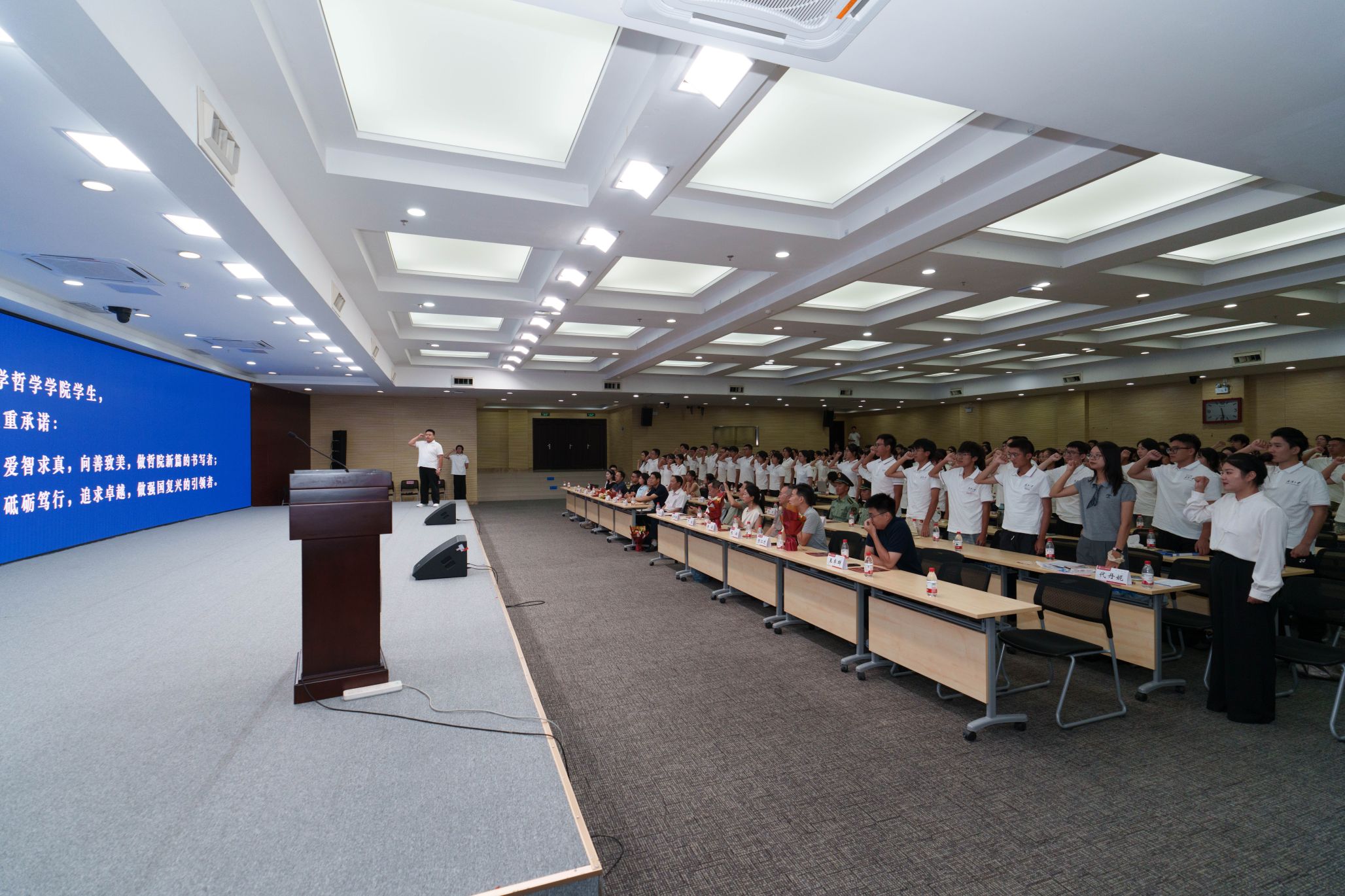 典礼最后,全体新生肃立宣誓。誓言铿锵,掷地有声,是新生们对未来学术道路的郑重承诺,更是他们青春斗志的鲜活写照。