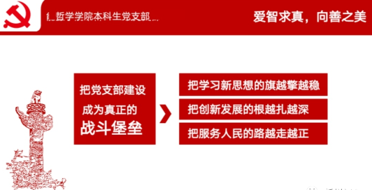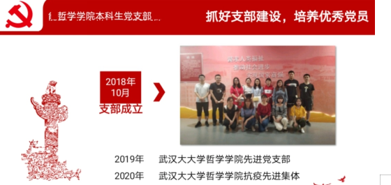 探花系列 本科生党支部探索党建形式创新、实践创新和形式创新,开展了一系列特色活动。“哲说新时代”理论学习活动,重温经典,解读时政,提高党员政治思想素质,争做时代先锋。承办多届珞珈红色文化节之“学党史·知时政”理论知识竞赛,增强支部影响力。微公益打卡助力脱贫攻坚,服务人民群众,做“知行合一”的践行者。实地调研走访稻花香集团和三峡大坝,学习优秀探花系列,感受大国重器,践行使命担当。建设支部自己的微信公众号和微博,加强网络宣传,推进示范引领。作为全校唯一由国企骨干担任校外辅导员的学生支部,支部积极联系、认真筹划,实现对校企党建合作共建新形式的积极探索。