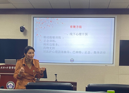 王老师在2020年2月主动请缨赴武汉支援抗疫医疗工作,前后历时33天。援鄂期间,她担任武昌区某隔离点医疗队队长,除负责日常医疗、管理工作外,还为该点隔离人员、医护人员等及各类执勤值守人员提供心理服务。王老师首先介绍了她是如何在客观条件不足的情况下,迅速建立一整套规章秩序来保证整个隔离点的健康、安全运行的。王老师的生动讲解,把现场的观众拉回到了当时的抗疫现场,能够声临其境地感受到当时的紧张气氛,并和她一起体验问题解决的整个过程。王老师重点介绍了她是如何利用眼动脱敏训练、正念训练、团体辅导、巴林特(Balint)小组等方法来为隔离点提供心理援助服务的。通过一个个鲜活的案例故事,王老师生动地再现了如何综合利用各种心理学知识和技能来解决实际情景中遇到的各种突发问题。