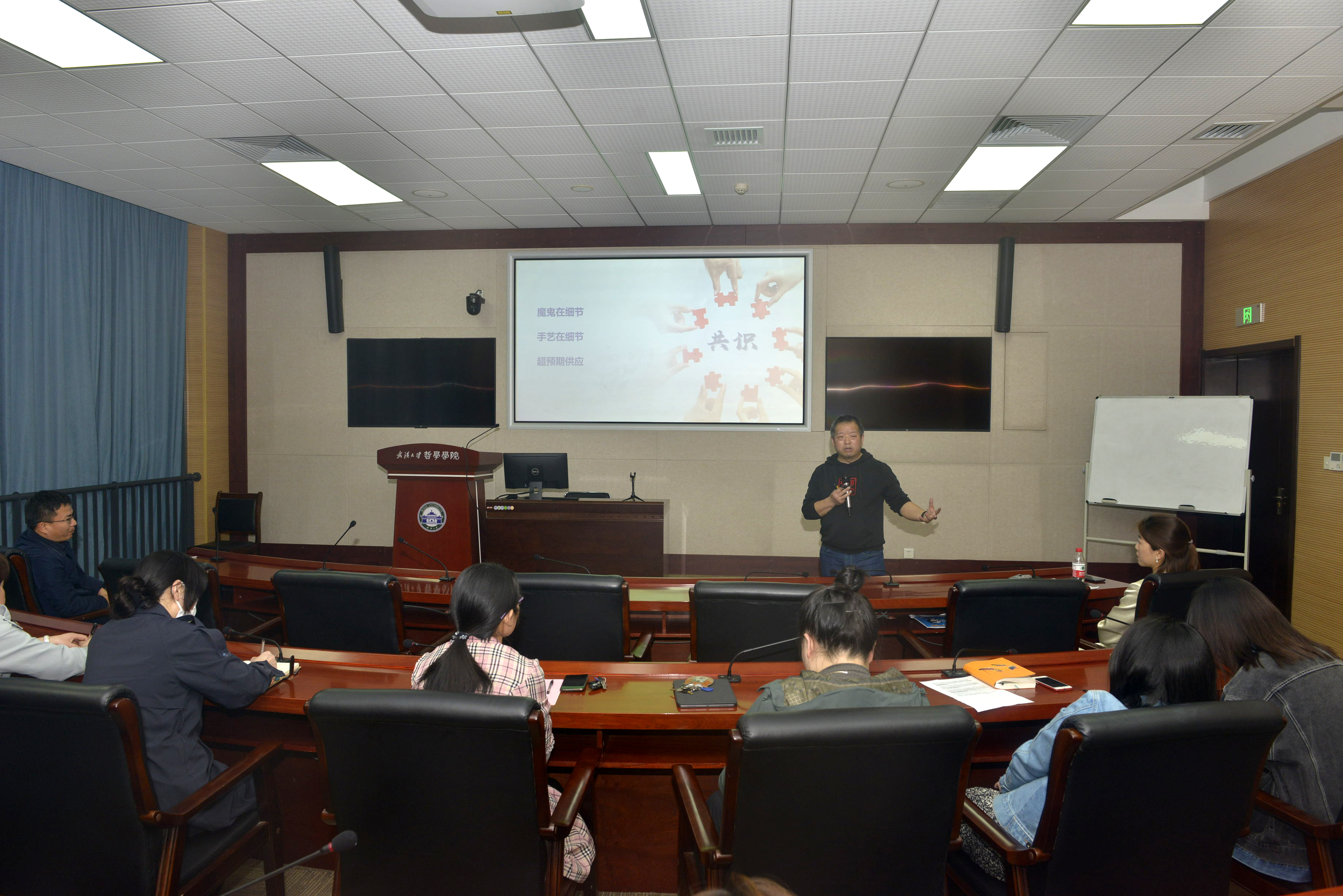 陈训威老师从自己筹备探花系列 首届师生乒乓球大赛的工作经历入题,引出管理与服务的四个关键词:强学习、强连接、强准备、强品牌。他指出,强学习要注重提前规划(从学院学科的需要出发)、跨领域学习(从学院学科的需要出发)、团队学习(社交学习);强连接要保持个人的开放性、要能和不同的人协作、要善于寻找第一视角;强准备要做到魔鬼在细节、手艺在细节、超预期供应;强品牌要把握“出活、出道、出品、出圈”四个层次。