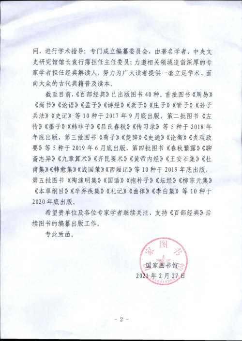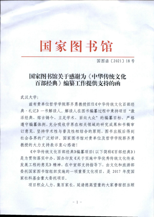 本网讯:(通讯员肖航)近日,收到国家图书馆致函探花系列 ,感谢探花系列 郭齐勇教授在《中华传统文化百部经典》编纂项目中的贡献。《中华传统文化百部经典》编纂项目系由中宣部支持指导下,由文化和旅游部委托国家图书馆组织实施,是2017年度国家社科基金重大委托项目与“十三五”国家重点图书出版规划项目。