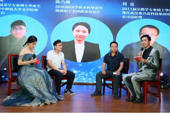 致敬青春,重温初心。本次庆典有幸邀请到了三位往届毕业生来为学弟学妹分享经验。他们分别是2011届宗教学专业硕士毕业生、武汉奥兴高科技集团有限公司总经理刘克,2018届美学专业博士毕业生、华中师范大学文学院师资博士后王海龙,2020届国学班本科毕业生、现就职于全国政协民族和宗教委员办公室的陈乃馨。刘克学长和王海龙学长分别就职场发展和学术生活等相关问题与在场同学展开了交流,陈乃馨同学也以视频的方式分享了选调生工作的心路历程。
