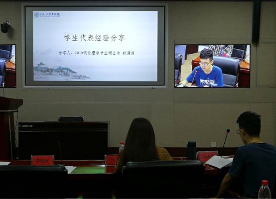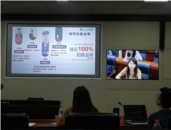 随后,党委副书记严璨就学生关切的问题,通过数据分析和图片分享详尽地展示了学院的学科特色、培养方式和就业状况,为同学们描绘了研究生学习生活图景。