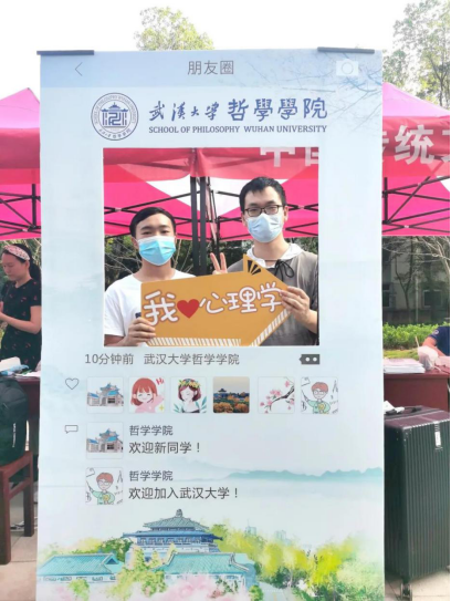最早前来报到的同学是21级心理学硕士新生童宇、赵开宸和21级宗教学硕士新生曾刚。他们对入学报道这件事格外兴奋,不到7点就到达了信部迎新地点,甚至比工作人员们还要早。工作人员到场后迅速为他们办完了报到手续,他们也在“朋友圈”展板后留下了开心的笑颜。