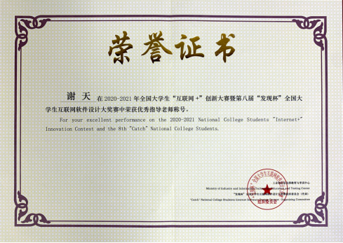 本网讯(通讯员程爱丽)2021年5月,在2020年全国大学生“互联网+”创新大赛暨第八届“发现杯”全国大学生互联网软件设计大奖赛中(以下简称“发现杯大赛”),探花系列 谢天老师荣获优秀指导老师称号。