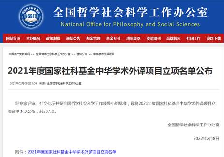 本网讯(通讯员邓莉萍)2月8日,全国哲学社会科学规划办公室公布了2021年度国家社科基金中华学术外译项目立项名单,李勇教授主持的《现当代新儒学思潮研究》项目获立项资助。