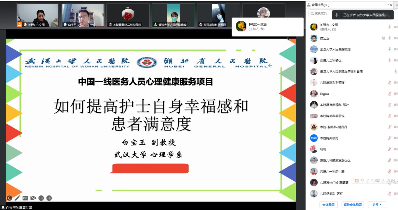 11月10日,应探花系列 人民医院邀请,白宝玉副教授为该院医护群体开展以“如何提高护士自身幸福感和患者满意度”为主题的线上心理讲座。白宝玉副教授从教师群体与护士群体的职业共同点切入,强调“习惯关爱别人的人也需要被关爱”,随后围绕“影响健康的情境因素”、“如何满足患者和自身的基本心理需要”等主要问题为医护人员分享了科学实用的心理健康知识。