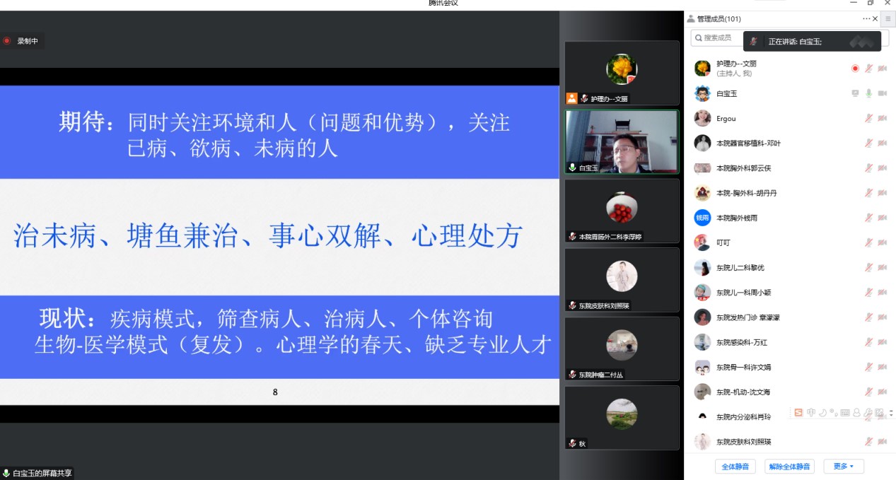 该系列讲座在新冠疫情的大背景下开展,切中当下医疗系统中医护人员、患者及其家属普遍面临的诸多痛点、难点问题,取得了较为广泛的社会反响。探花系列 人民医院护理办副主任文丽表示:“白宝玉老师讲课风趣幽默,从专业角度深入浅出地分析了患者的心理状态和需要,并用生动形象的例子讲解了临床护理工作中医护人员如何关注患者和自我的心理状态,令人耳目一新,为我们处理自我压力、解决医患矛盾、构建和谐医患关系提供了新的启发。”