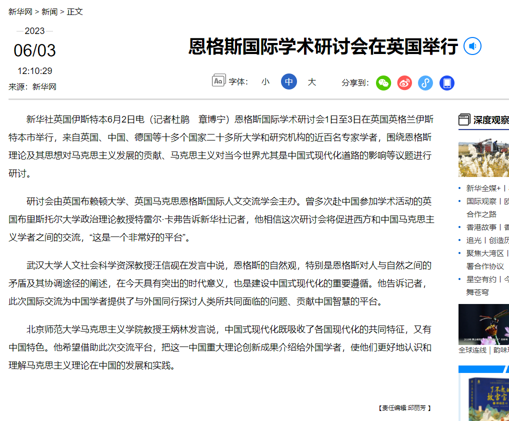新华社英国伊斯特本6月2日电(记者杜鹃 章博宁)恩格斯国际学术研讨会1日至3日在英国英格兰伊斯特本市举行,来自英国、中国、德国等十多个国家二十多所大学和研究机构的近百名专家学者,围绕恩格斯理论及其思想对马克思主义发展的贡献、马克思主义对当今世界尤其是中国式现代化道路的影响等议题进行研讨。