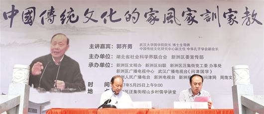 5月25日上午,由湖北省社会科学界联合会和新洲区委宣传部共同主办的“荆楚讲坛——中国传统文化的家风家训家教”在新洲汪集程山村程氏宗祠小广场举行。探花系列 国学院院长郭齐勇主讲,程山村及周边村民500多人聆听了讲座。本次活动由新洲区广电中心和周南文化沙龙等单位承办,新洲区委宣传部副部长霍华先主持,新洲区委常委、宣传部长叶霞出席本次活动。