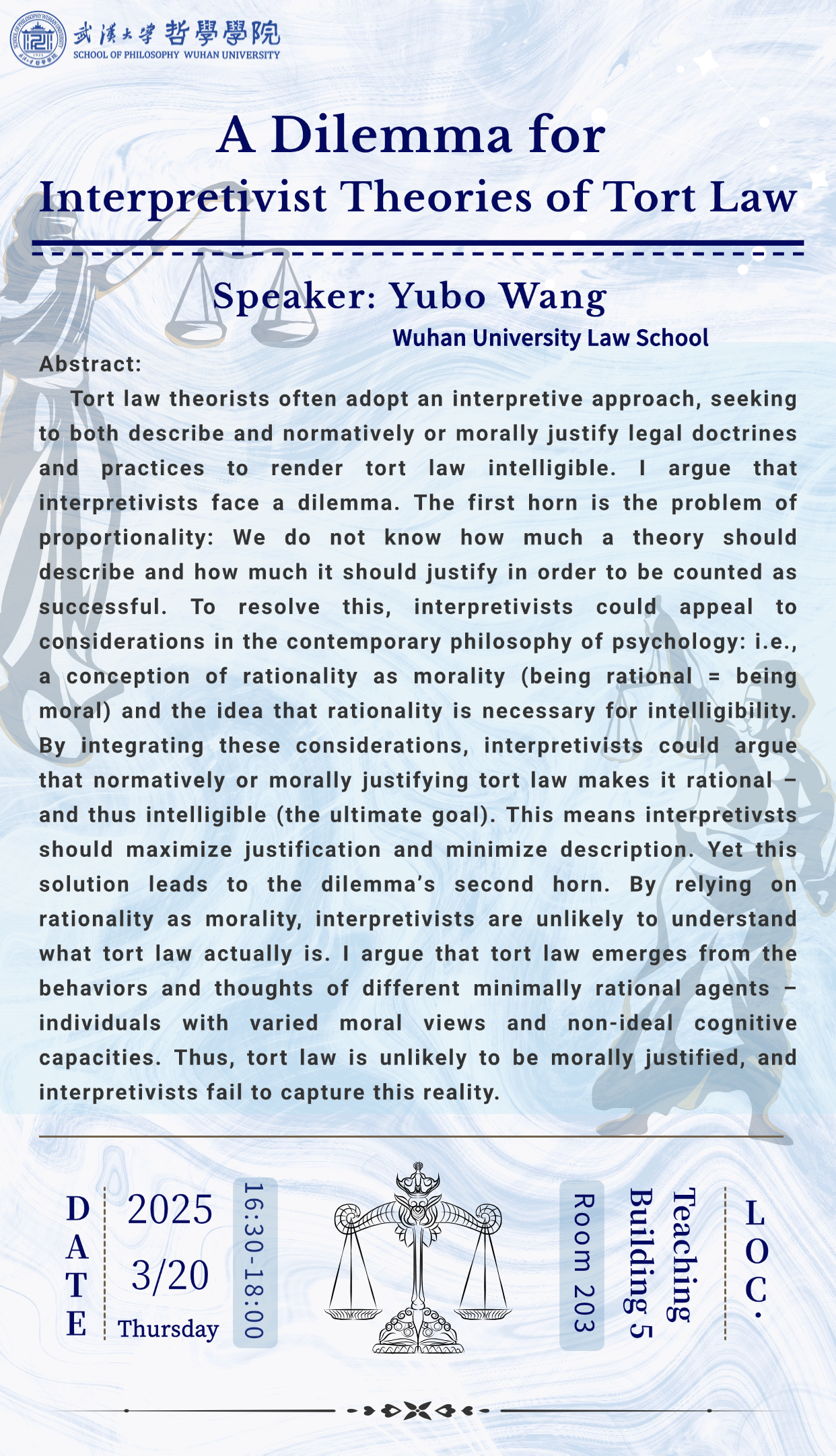 【3月20日】讲座预告 | A Dilemma forInterpretivist Theories of Tort Law