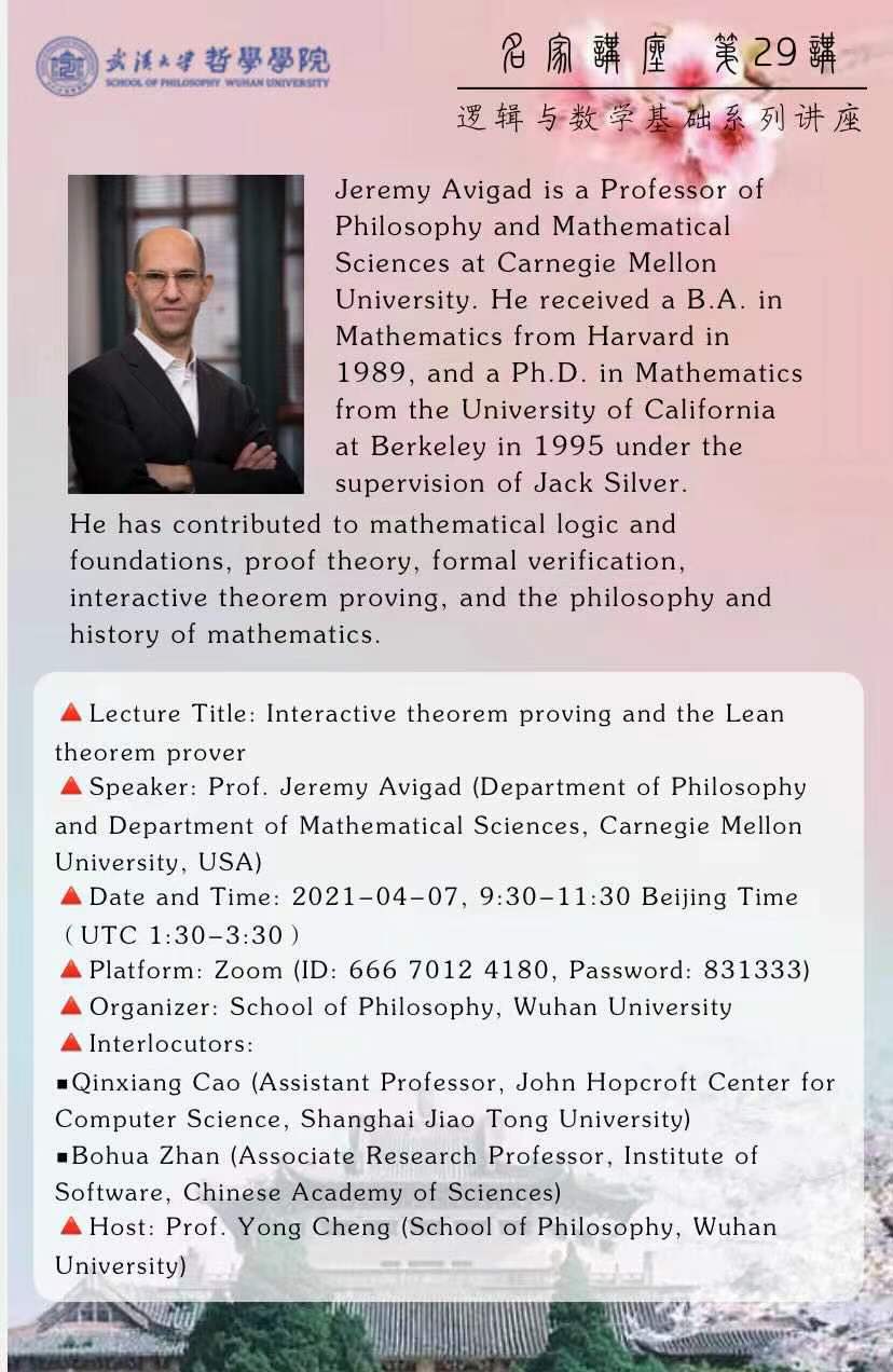 【4月7日】名家讲座第29讲:“Interactive theorem proving and the Lean theorem prover”——逻辑与数学基础系列讲座