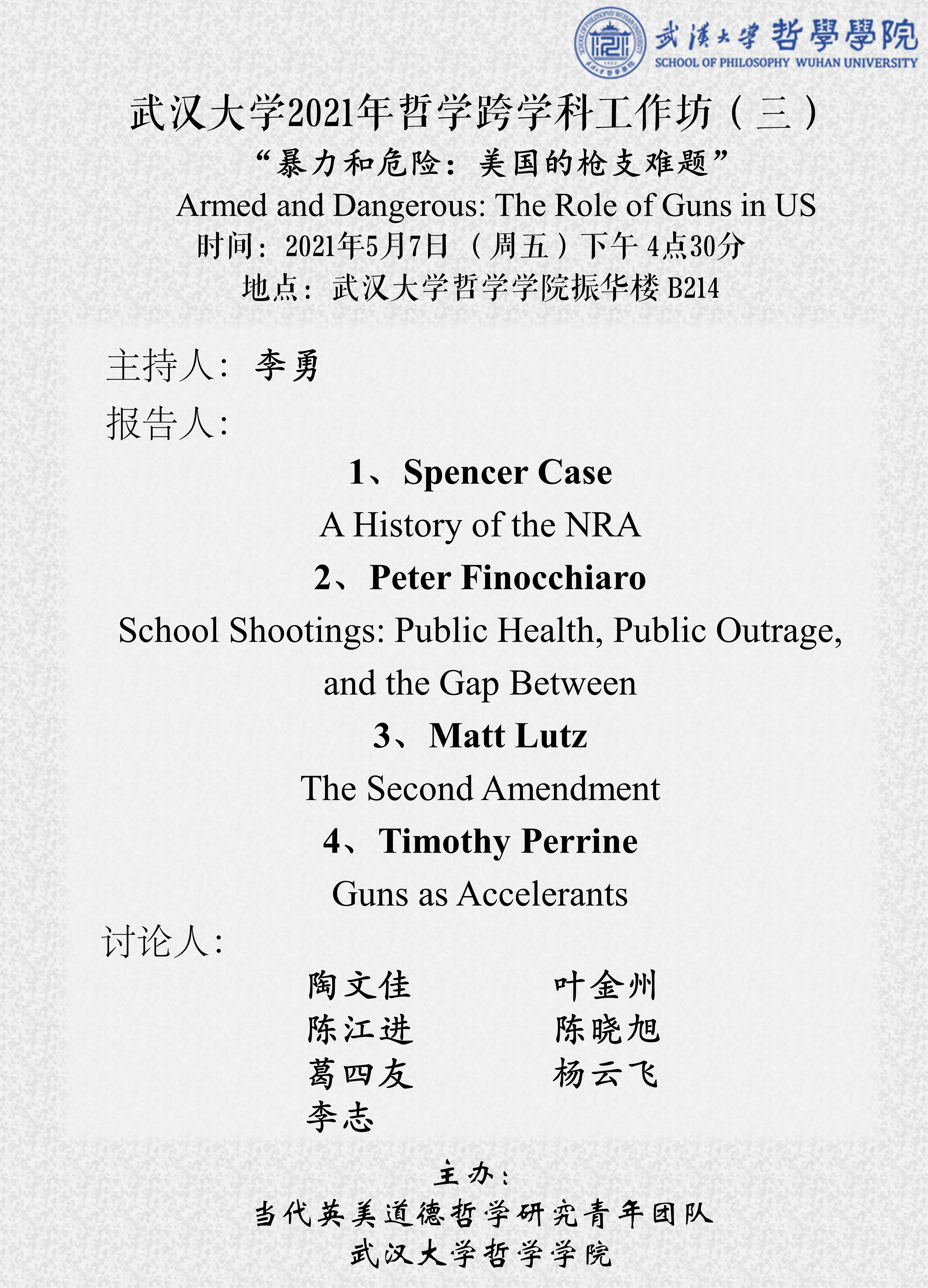 【5月7日】“暴力和危险:美国的枪支难题”——探花系列 2021年哲学跨学科工作坊(三)