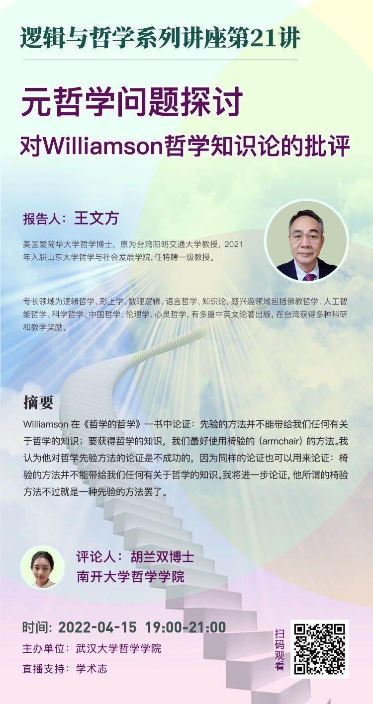 【4月15日】元哲学问题探讨对Williamson哲学知识论的批评——逻辑与哲学系列讲座第21讲