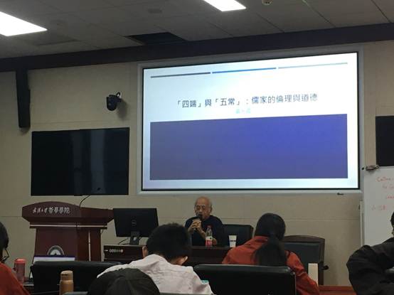 讲座中,黄光国教授从儒家的历史过程出发,以科举制度和水浒“社会”为例,仔细梳理了儒家心理学的发展变化,从《关系论》、《心性论》、《天道观》,到汉代董仲舒的“三纲五常”之说基本奠定了《关系论》,再到宋代进一步分裂为“道问学”和“尊德性”两种方向,使在场师生对儒家思想的演变有了更加清晰的认识。