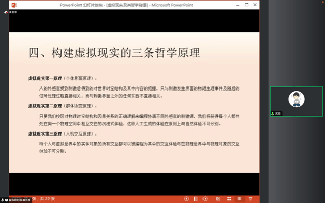接下来,翟振明教授分别介绍了构建虚拟现实的三条哲学原理和人机交互三原则。虚拟现实三原理分别是:个体界面原理(虚拟现实第一原理)、群体协变原理(虚拟现实第二原理)和人机交互原理(虚拟现实第三原理)。其中,个体界面原理是指,人的外感官受到刺激后得到的对世界时空结构及其中内容的把握,只与刺激发生界面的物理生理事件及随后的信号处理过程直接相关,而与刺激界面之外的任何东西不直接相关。群体协变原理是指,只要我们按照对物理时空结构和因果关系的正确理解来编程协调不同外感官的刺激源,我们将获得每个人都共处在同一个物理空间中相互交往的沉浸式体验,这种人工生成的体验在原则上与自然体验不可分别。人机交互原理是指,每个人与虚拟世界中的实体对象的所有交互都可以被编程为虚拟世界中的交互体验,该体验与在物理世界中与物理对象的交互体验不可分别。