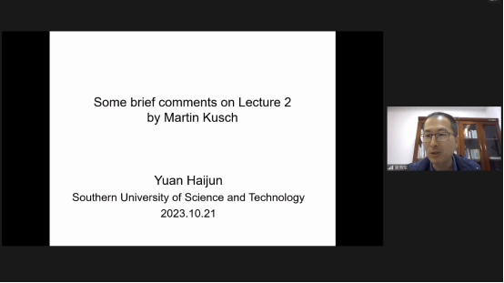 在评议环节,袁海军总结了讲座内容并提出六个问题:一是哲学或社会学是否有可能辨明知识和社会的关系;二是关于科学或知识与民主社会关系的合适哲学理论应该是什么,基切尔的“良序科学”是否是一个代表;三是应该如何理解“形而上学命题是社会学命题”;四是我们是否应该将心灵哲学和语言哲学作为解决知识和社会关系之谜的理论资源;五是库什和约翰·塞尔关于社会身份(social status)的论述存在哪些区别;六是SSK和福柯之间存在什么关系。