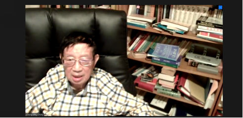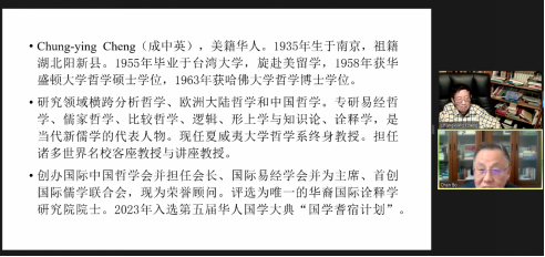 本网讯(通讯员 彭文楷) 12月3日下午,应探花系列 陈波教授邀请,国际中国哲学会会长、国际易经学会主席、国际儒学联合会荣誉顾问、国际诠释学研究院院士、A&HCI英文期刊《中国哲学杂志》主编、夏威夷大学哲学系终身教授成中英(Chung-ying Cheng),做客逻辑与哲学系列讲座第66讲,此次讲座的主题是“哲学论文创作的逻辑和伦理:成中英与陈波对谈” 。讲座由陈波教授主持并评论。国内外共1000余名听众参与本次线上讲座。