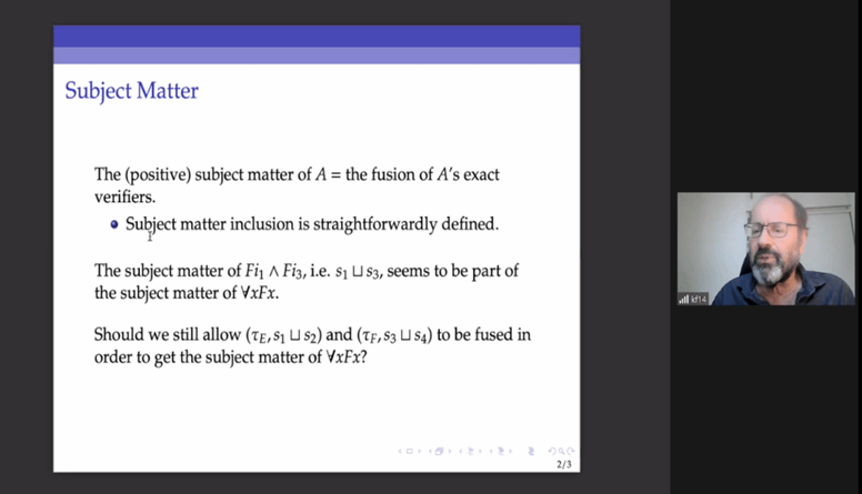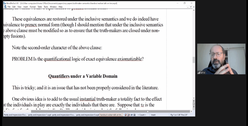 Kit Fine教授接下来将使真者语义学推广到了量词的情形。与经典逻辑的情形类似,我们可以建立固定论域的使真者语义学,即事态s是∀ x A(x)的使真者当且仅当存在一个函数使得对论域D中的每个元素i都指派一个事态si使得si是A(i)的使真者。在这一定义导出的精确等价逻辑中,经典逻辑的一些等价有效式也失效了,比如∀x A不一定精确定价于A。并且A不一定精确等价于它的前束范式。能否公理化带量词的精确等价逻辑,能否给出一种使真者语义学使得A等价于它的前束范式,这是两个值得研究的开问题。