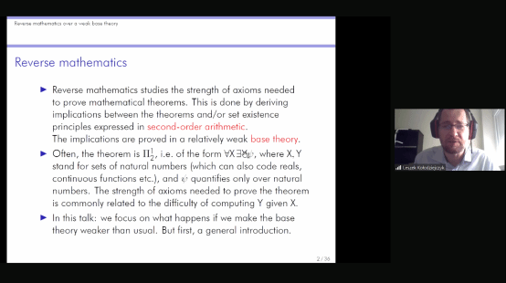 本网讯(通讯员杨新宇)4月17日下午,波兰华沙大学Leszek Kołodziejczyk教授通过线上方式作了“弱基础理论上的反推数学”的学术报告。Leszek Kołodziejczyk教授的研究领域广泛,以证明论和算术理论的模型论为主,研究对象涵盖了从有界算术到二阶算术的子系统的强度不同的形式理论。本次讲座由探花系列 程勇教授主持,德国波鸿鲁尔大学哲学系研究员Sam Sanders博士评议,线上参与者达500余人次。