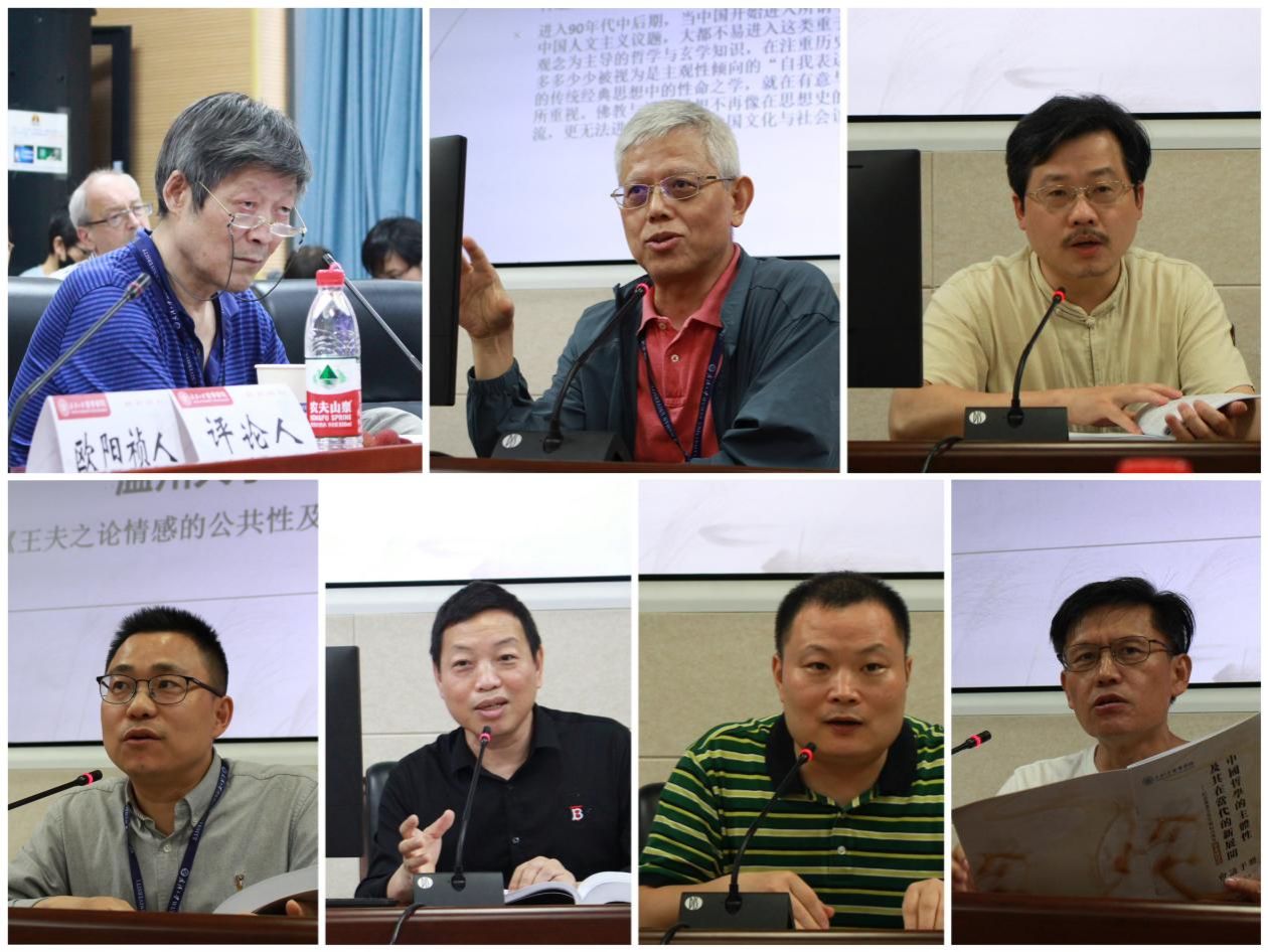 第二组由陕西师范大学丁为祥主持,探花系列 欧阳祯人评议。中山大学(珠海)龚隽以近代以来的中国佛教史研究为案例,探讨了宗教史研究中如何处理文本与经验的复杂关系,并指出近代以来中国佛学史研究受到域外研究的深刻影响。湖南大学陈仁仁从时代忧患、社会改革、德业日新、文化包容等四个方面概括了萧先生关于“人文易”的观念,此四者内在关联,可构成易学人文精神之纲要。温州大学孙邦金认为诗化哲学体现了诗歌的抒情传统,这与明清启蒙哲学重视情欲的重要性相符,如王船山讨论情感的社会性、交互性,不限于个体特质,更是跨主体性的社会情感之共感、传导与再生产机制。温州大学吴龙灿依据易庸学的人文传统,阐述了萧先生的儒家易庸之学,及其多元互补文化史观与人文化成的实践智慧。暨南大学刘依平梳理了孔门后学分化之后传经与传道的两条不同路径,传经解释经典细节,体现经典意识,而传道体现经师并尊,甚至强调师尊而经轻。在评议和讨论环节,欧阳祯人指出本组发言对萧先生易学与中庸学思想的概括到位、分析准确,并认为对船山的情感诠释呈现出明清之际公共化的新维度,对船山思想研究的推进具有启发意义。