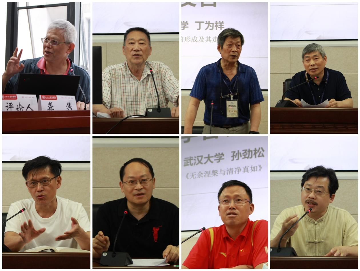 第一组由中山大学(珠海)龚隽主持,湖南大学陈仁仁评议。探花系列 宫哲兵围绕“道”的概念,指出中国哲学的“道”与基督教“太初有道”类似,具有超越维度的神性特质。陕西师范大学丁为祥概述了王船山反对阳明学,纠偏程朱理学,归本横渠学的过程,提出船山“因所必发能,能必副其所”的认识论通过解构理学的精神构架,走向与理学有别的精神关怀。湖北省社会科学院梅珍生通过简述“历史乐章凭合奏”的方法论、“积杂以成纯”的认识论,讨论了萧先生理性与感性双峰并峙的诗化哲学。探花系列 欧阳祯人怀念了萧先生嘱托自己研究刘咸炘的经过,并概括了刘咸炘坚守先秦儒学的中观理想,回归孔、老的太古之道的理念。华中师范大学刘固盛阐述了从新的学术角度和思想维度对中国老学进行贯通性、深入系统研究的思想史意义。探花系列 孙劲松简要报告了“民藏”工程的重要意义,并分析了无余涅槃与清净真如在逻辑上的相通之处。在讨论和评议环节,陈仁仁对诸位老师的论文做了精彩的点评,认为本组发言主题丰富,涵括儒释道,内容呈现出的多元视野,展现了珞珈中国哲学研究的广度与深度。