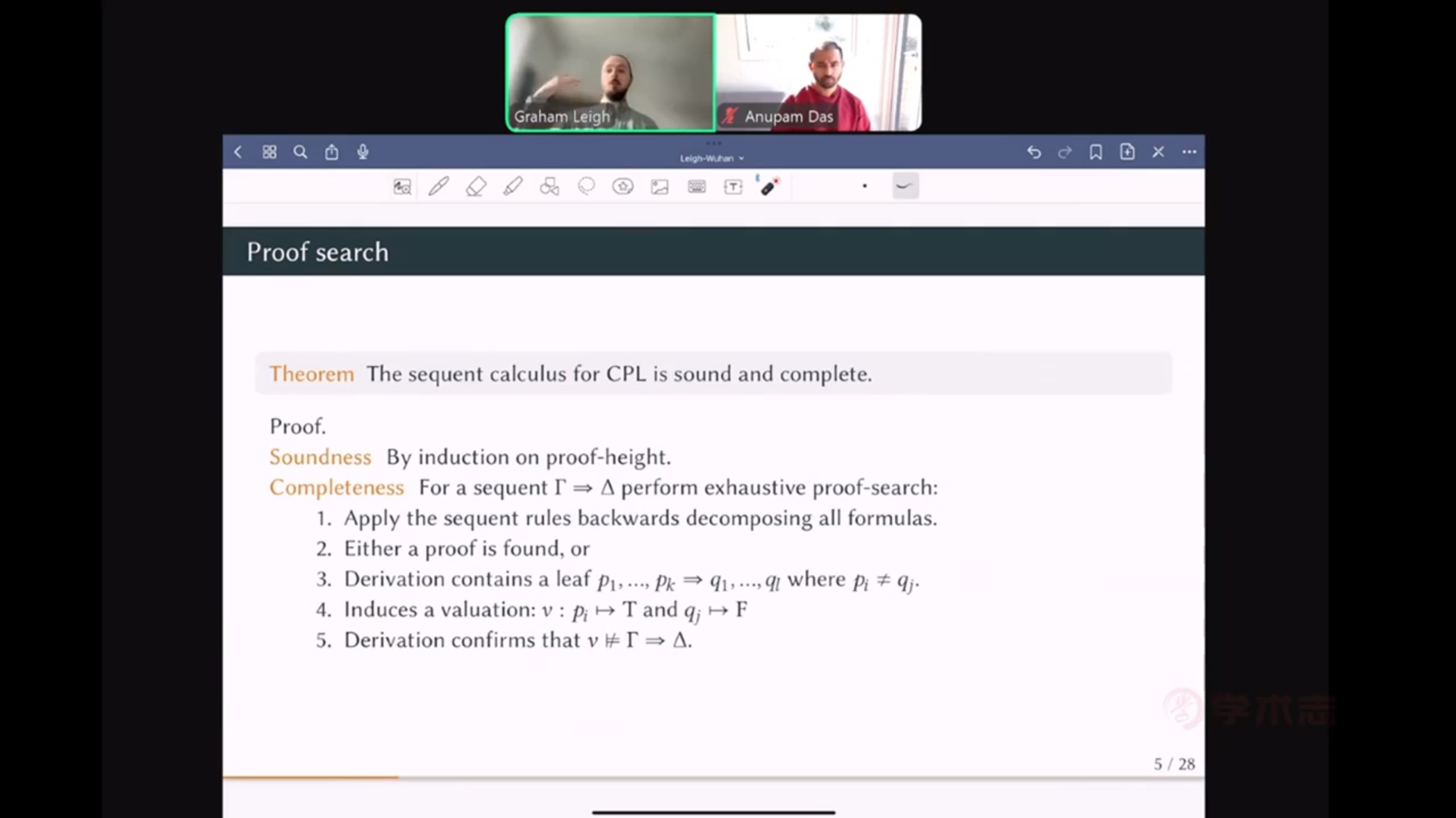 Leigh教授首先回顾了命题逻辑的矢列演算(sequential calculus)系统CPL,这一系统具有可靠性和完全性,对于可靠性的证明可以通过施归纳于证明的高度,对于完全性的证明则是通过证明搜索(proof search)的技术证明,即通过对一个矢列的公式分解,我们要么可以得到该矢列的在系统中的一个证明,要么可以构造出不满足该序列的一个真值指派。CPL的另一个重要性质是一些规则的可允许性(admissibility)。通过证明变换(proof transform)的方法我们不仅可以证明CPL初始规则的逆规则是递归地可允许的,还可以证明切割(cut)规则是递归地可允许的,这就是著名的切割-消除(cut-elimination)定理。切割-消除具有很好的性质,逻辑学家Mints在1978年证明了切割-消除可以看作是推演空间上的连续算子。