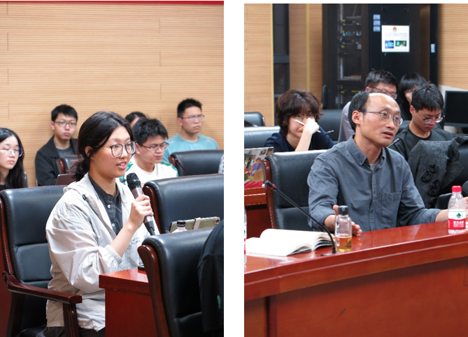 提问环节中,现场听众与楼巍教授积极互动。同学们的问题涵盖“颜色感知的哲学属性”、“人工智能是否理解语言意义”、“私语化的文学作品是否倾向形成私人语言”、“如何理解语法命题的无意义”等。苏德超教授提出:“如果对私人语言和私人对象加以强否定,会将人贬为‘哲学僵尸’;如果弱否定,私人语言无法在公共语言中得到表达无非是一个琐碎的事实。维特根斯坦究竟持怎样的观点?”。对于上述问题,楼巍教授做出了精彩详实的回应。在讨论中,楼教授与苏教授拓展了许多相关知识内容,如感觉材料主义观点、行为主义观点、威廉詹姆斯的观点、宗教语言的案例、实用主义观点等,进一步深化了大家对维特根斯坦语言哲学的理解。