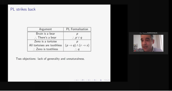 Paseau教授以“如何描述有效性”出发,介绍了当下主流观点:一个论证有效当且仅其形式的所有实例保真。由这个观点我们可以得到一般的形式方法用来判断对于一个自然语言下的语句集S,它是否可以推导出一个论断s。首先是将语句集S和s形式化到我们选取的逻辑系统L中。而在一个逻辑形式系统中,我们通常以语义(逻辑蕴含)和语法(形式推演)的方式来判断一个推导是否是有效的。我们虽然可以很熟练地完成这一步形式化,但问题是从自然语言到一个逻辑系统的“形式化”究竟是什么?是否存在一个评判标准来界定某种形式化方法是否是良好的?从字面意思看,形式化(formalisation)是将自然语言(如英语)句子映射到形式逻辑语言(如命题逻辑 PL、一阶逻辑 FOL)的过程。接着,教授介绍了三个传统的评判标准。第一个是“保持蕴含关系”,即形式化应保留自然语言中的蕴含结构,如 “布鲁因是熊” 蕴含 “存在熊”;第二是“尊重语法结构”,形式化需贴近自然语言的语法结构,如合取式对应自然语言中的“且”。比如将“今天下雨”形式化到命题逻辑通常是一个命题变元”