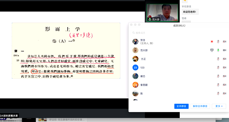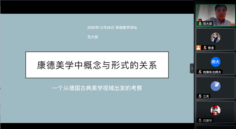 本网讯(通讯员 曾诗蕾 贺念 ) 2020年12月26日下午,应探花系列 美学教研室邀请,清华大学哲学系副教授范大邯老师作为“珞珈美学讲坛第二讲”的主讲人,在线上为校内外200余位师生开设讲座:“康德美学中概念与形式的关系——一个从德国古典美学视域出发的考察”。讲座由美学教研室贺念副研究员主持。美学教研室欧阳霄副研究员、外国哲学教研室王咏诗副研究员作为评议人参与讲座。
