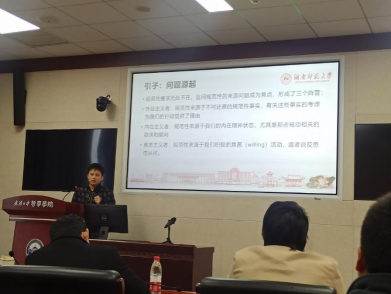 紧接着,文老师对科斯嘉和张美璐的意志主义理论进行了介绍和批评。科斯嘉的意志主义理论被称为“构成主义”。构成主义试图通过实践的道德概念描述道德现象,规定道德标准,进而解决道德生活中的冲突;构成主义认为规范性问题是第一人称问题,规范性问题是道德行为者本人的问题,进而回应了道德怀疑论的批评;而反思能力通过自由自由意志给出绝对命令使我们具有规范性。然而,构成主义还面临着倒退问题和主体间性问题。接着,文老师介绍了张美璐的混合意志主义(hybrid voluntarism)理论。这个理论认为,规范性或者是通过规范性事实或是欲求等消极状态给予我们的,或者是通过意志创造意志主义理由给予规范性。并且,除非我们给定的理由完全不能决定我们应该做什么,否则我们不能把基于意志的理由带入场,即我们只能在给定理由耗尽时才能创造意志主义理由。在两种情况下,给定理由是耗尽的:平衡,或是不确定地等价。而此时自由意志创造的意志主义的理由是的一个人成为独特的规范性能动者,凸显了人的自由。文老师指出,这个理论没有告诉我们规范性事实在何种意义上构成了对我们的规范。