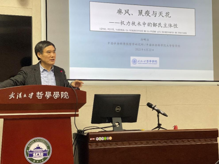 第一场讲座的主题是“麻风、鼠疫与天花——权力技术中的鄙民主体性”,本场讲座由文明对话高等研究院院长吴根友教授主持,中国哲学教研室、心理学教研室多位老师与学生参加了本场讲座。汤老师第一场讲座用医学史上麻风、鼠疫、天花三种大流行病的控制手段来解释福柯的权力技术分析,即法律机制以麻风的控制手段驱逐和排斥为特征,规训机制以鼠疫的控制手段分隔和监视为特征,安全机制以天花的控制手段自身免疫和预防为特征。在这三种权力机制中都存在有关鄙民(plèbe)的主体性构造,汤老师认为,鄙民可分为无产阶级化的底层和非无产阶级化的底层,后者又分为边缘人和工具人,鄙民不同于国家意识形态构造的人民,尤其是边缘人具有应具体事件而生的反抗性,多变不可招安。汤老师在讲座最后谈到,福柯哲学并不提供问题的答案,恰恰相反,他反对任何标准答案,而是批判性的思考。