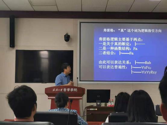 王路教授以亚里士多德与弗雷格的逻辑学为例,说明把being理解为“是”、把truth理解为“真”的根据所在。亚里士多德逻辑学的基本句式是“S是P”,其中S涉及“所有”和“有些”两类量词,P涉及“是”与“不是”两类判断,因而就有了四类基本命题:“所有S是P”,“所有S不是P”,“有些S是P”,“有些S不是P”。其中S是判断的主词,也是对象、被谈论的事物、个体;P是判断的谓词,也是谓述、对事物的表述、范畴;“是”是肯定,也是判断、命题、认识与真;量词则涉及到普遍、特殊、一般、整体、部分等概念。据此,亚里士多德就构建起以being为核心的逻辑学系统。然而,亚里士多德对truth的重视不足,直到弗雷格的现代逻辑,truth为逻辑指引了方向。弗雷格的逻辑系统有两个基本要素:用断定符号所表达的关于真的断定,和用Fa表达的函数结构。在分析哲学的视角看来,函数结构形成了谓词Fx,基本句法Fa,以及基本语义(真或假)。相对于传统逻辑学,弗雷格的逻辑学的优势在于表达丰富与语义清晰。讲解完亚里士多德和弗雷格的逻辑学后,王路教授总结说,不同的逻辑导致了不同的哲学形态,以being为核心的亚里士多德逻辑塑造了传统哲学,以truth为核心的弗雷格逻辑则塑造了分析哲学。