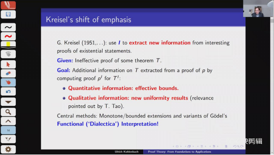 2021年3月9日下午4点,逻辑与数学基础系列讲座第15讲由德国达姆施塔特工业大学数学系Ulrich Kohlenbach教授线上主讲,报告题目是“证明论:从数学基础到核心数学中的应用”。探花系列 程勇教授主持,英国巴斯大学计算机科学系Thomas Powell博士、德国波鸿鲁尔大学哲学系Sam Sanders博士、杭州电子科技大学数学系徐洪坤教授担任与谈人。讲座由伟大的Hilbert计划出发,讲到Kreisel的开创性思想。Kreisel将证明论的重点从仅仅是数学理论的一致性问题转移到这样一个问题上:“如果我们用有限的方法证明了一个定理,除了知道它是真的,我们还能知道什么?”在此基础上,Ulrich Kohlenbach引出了本次讲座的核心内容:证明挖掘。紧接着,Ulrich Kohlenbach概述了证明挖掘在核心数学中的应用。在过去的20年里,使用证明挖掘方法人们在如下领域已发现大量新的定量结果和定性结果:非线性分析,不动点理论,遍历理论,拓扑动力学,逼近理论,凸优化,抽象柯西问题,追踪-回避博弈。Ulrich Kohlenbach介绍了证明挖掘的应用基础,如何将一个给定的证明翻译成一个新的证明使得新证明是基于直觉主义逻辑,同时还使用了理想的元素。讲座的最后,Ulrich Kohlenbach从凸优化、追踪-逃避博弈、遍历理论三个方面,具体讲解了证明挖掘在核心数学中的应用。