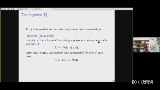 2021年5月18日下午4点, 逻辑与数学基础系列讲座第19讲由捷克科学院数学研究所Pavel Pudlák教授线上主讲,报告题目是:“从皮亚诺算术到证明复杂性”。荷兰乌得勒支大学哲学系教授、荷兰皇家人文与科学学院Albert Visser院士主持,新加坡国立大学数学系杨跃教授、比利时根特大学数学系Fedor Pakhomov博士担任与谈人。证明复杂性是与逻辑、计算复杂性和组合优化相关的一个快速增长的领域。报告伊始,Pavel Pudlák首先介绍了证明复杂性的起源和历史发展。它始于20世纪初Hilbert学派的研究,其目的是证明PA的完备性与一致性。20世纪30年代,哥德尔创造性的成果推翻了Hilbert学派的猜想,其成果主要有两个核心要点:一是对证明进行编码,二是构造了自指语句。20世纪70年代,伴随着计算复杂性理论的出现,人们的研究重点转向PA的片段子理论,并发现了其弱片段与复杂性类之间的联系。紧接着,报告对证明系统的基本概念做了介绍。一个证明系统可以是任何二元关系R(x,y)(y是x的一个证明),并满足以下性质:系统是可靠的;系统是完备的;二元关系在多项式时间算法中是可判定的。然后,Pavel Pudlák又介绍了来自组合优化的证明系统。 证明复杂性这一新兴领域的另一个推动力来源于此。 讲座的最后,Pavel Pudlák对证明复杂性这一研究领域做了总结。它不仅仅是对证明长度的研究,它包含了所有对弱形式系统及与可行性计算相关联的系统的研究。Pavel Pudlák用一个具体的例子演示了如何使用命题证明复杂性来证明一个独立性结果。
