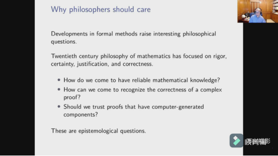 2021年4月7日上午9:30,逻辑与数学基础系列讲座第17讲由美国卡内基梅隆大学哲学系、数学系Jeremy Avigad教授线上主讲,报告题目是:“交互式定理证明与Lean定理证明器”。探花系列 程勇教授主持,上海交通大学John Hopcroft计算机科学中心曹钦翔助理教授、 中国科学院软件研究所詹博华副研究员、北京大学哲学系王彦晶教授参加与谈。讲座伊始,Jeremy Avigad对交互式定理证明进行了简要的概述。借助于计算机证明助理,数学在实践中是可以形式化的。 使用这样的证明助理,用户可以构造一个形式化的公理证明。在许多系统中,这个证明对象可以单独提取和验证。紧接着,讲座针对三类人群——数学家、逻辑学家、哲学家来探讨为什么他们要关注这一领域。对于数学家,形式化证明助理是种可以帮助我们更好地做数学的工具。对于逻辑学家,形式化方法依赖于诸多逻辑学中的经典结果。对于哲学家,形式化方法的发展提出了一些有趣的哲学问题。讲座的最后,Jeremy Avigad介绍了一个特定的定理证明器——Lean,越来越多的数学家开始使用它,并做出一些重要的成果。